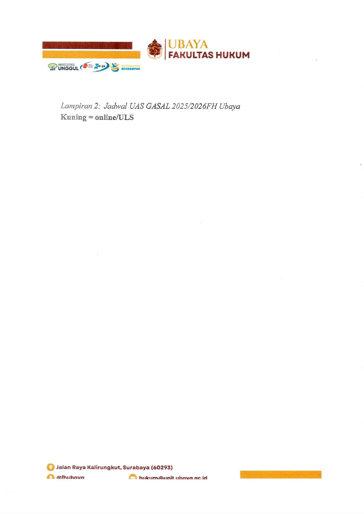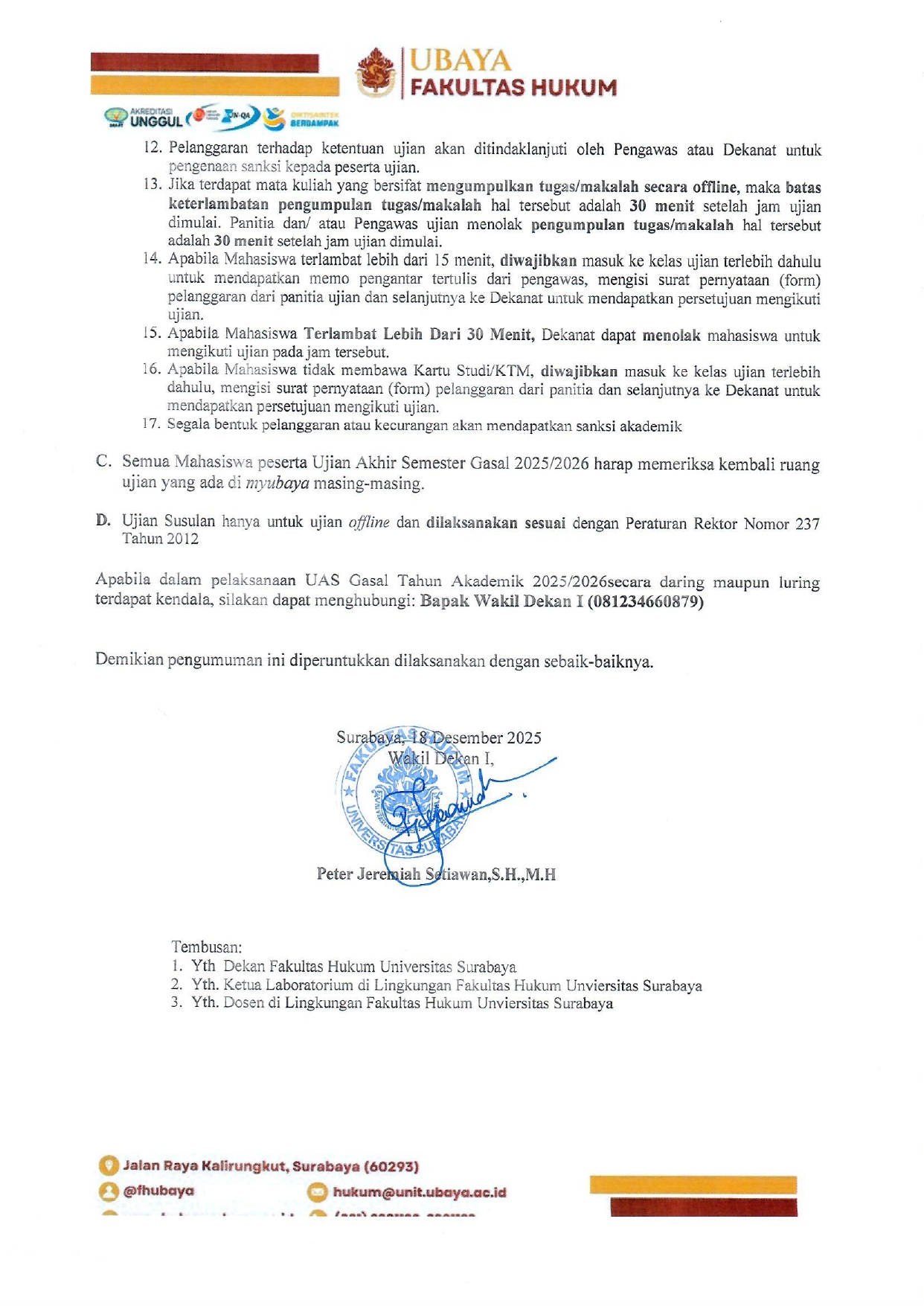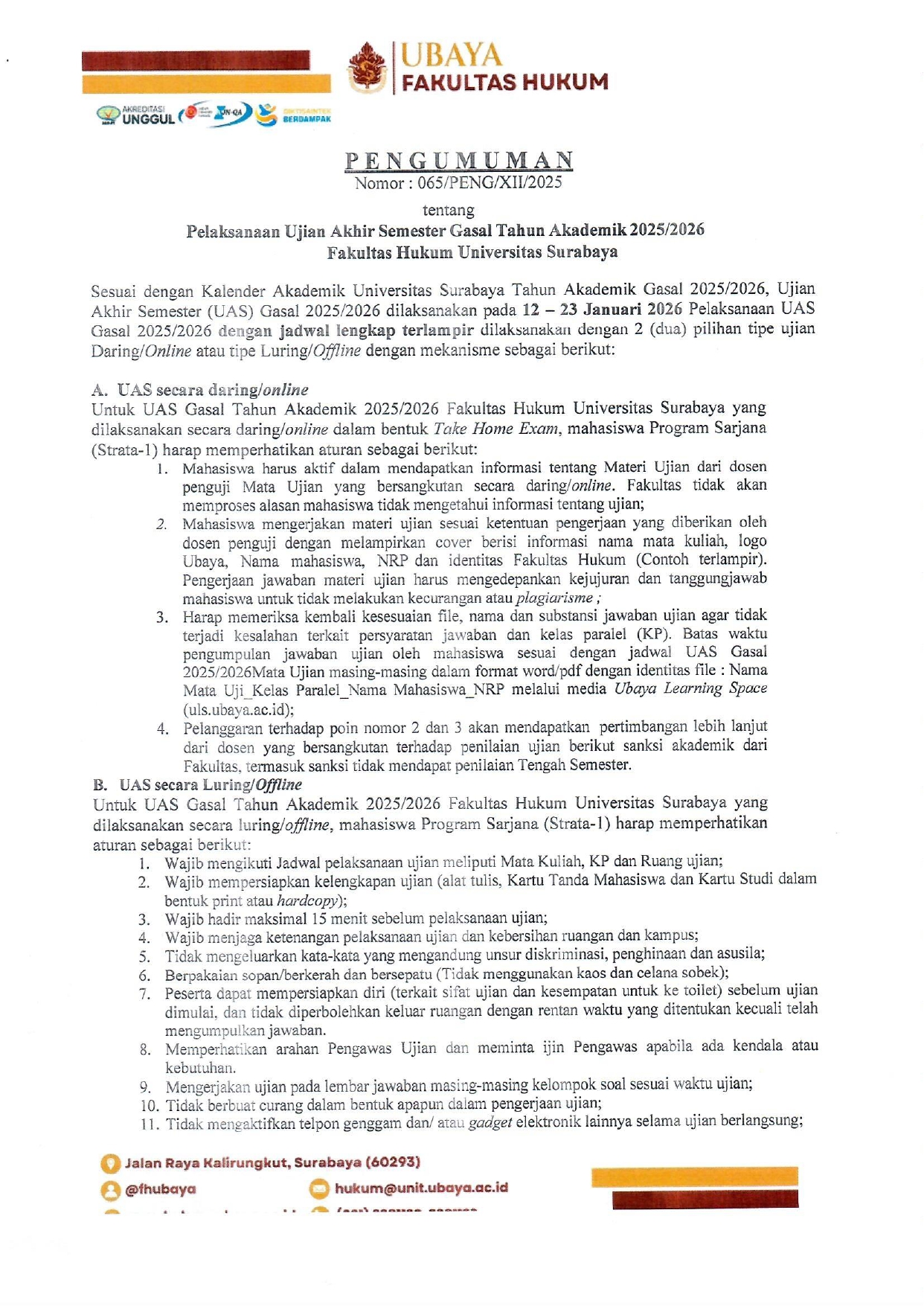Untuk UAS Gasal Tahun Akademik 2025/2026 Fakultas Hukum Universitas Surabaya yang dilaksanakan secara luring/offline, mahasiswa Program Sarjana (Strata-1) harap memperhatikan aturan sebagai berikut: