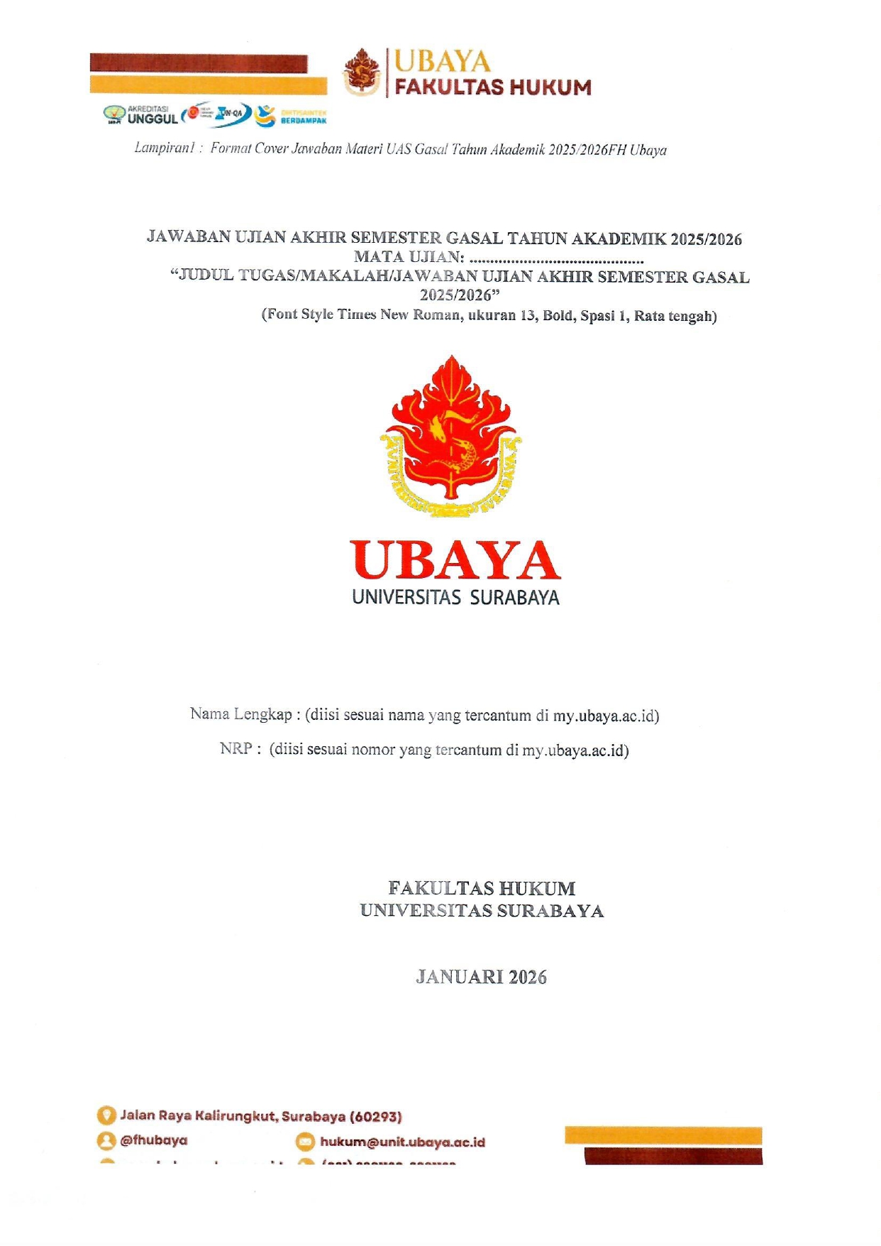 2. Mahasiswa mengerjakan materi ujian sesuai ketentuan pengerjaan yang diberikan oleh dosen penguji dengan melampirkan cover berisi informasi nama mata kuliah, logo Ubaya, Nama mahasiswa, NRP dan identitas Fakultas Hukum (Contoh terlampir). Pengerjaan jawaban materi ujian harus mengedepankan kejujuran dan tanggungjawab mahasiswa untuk tidak melakukan kecurangan atau plagiarisme ;