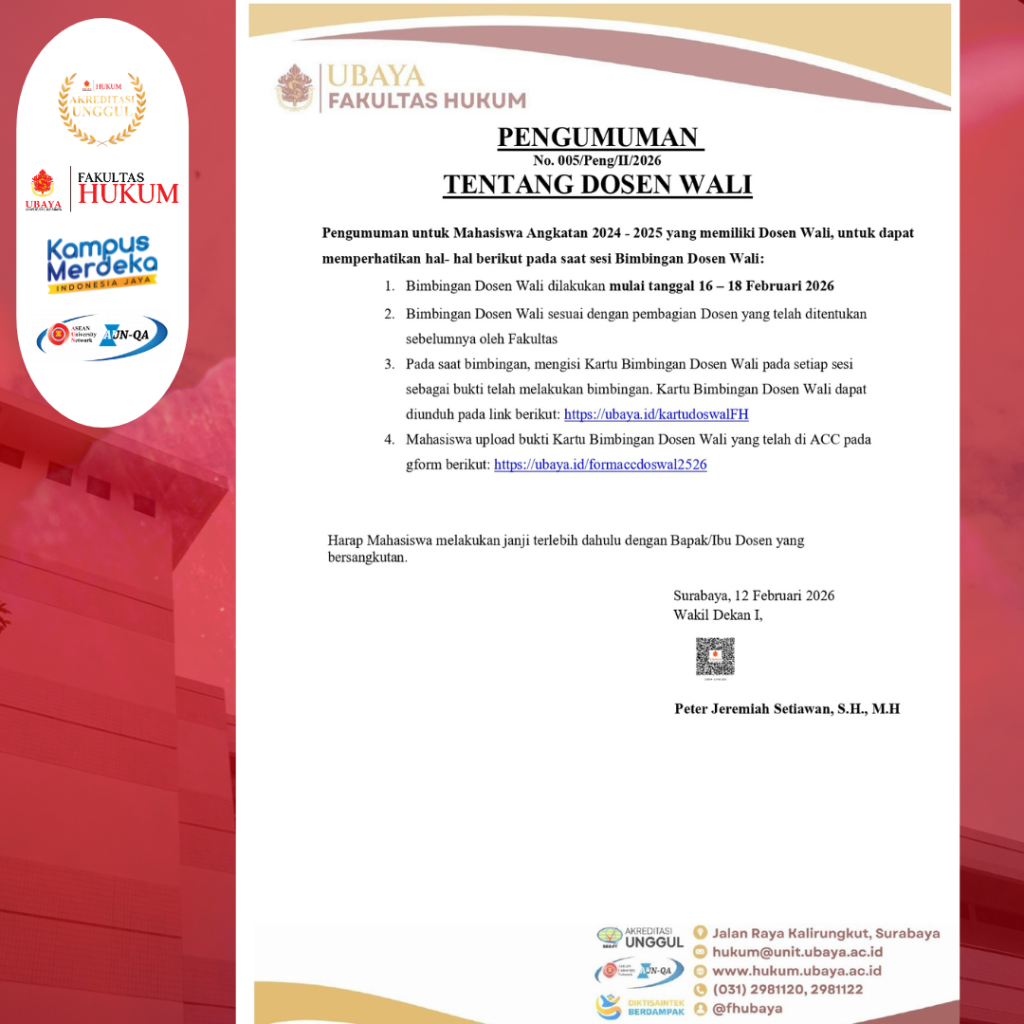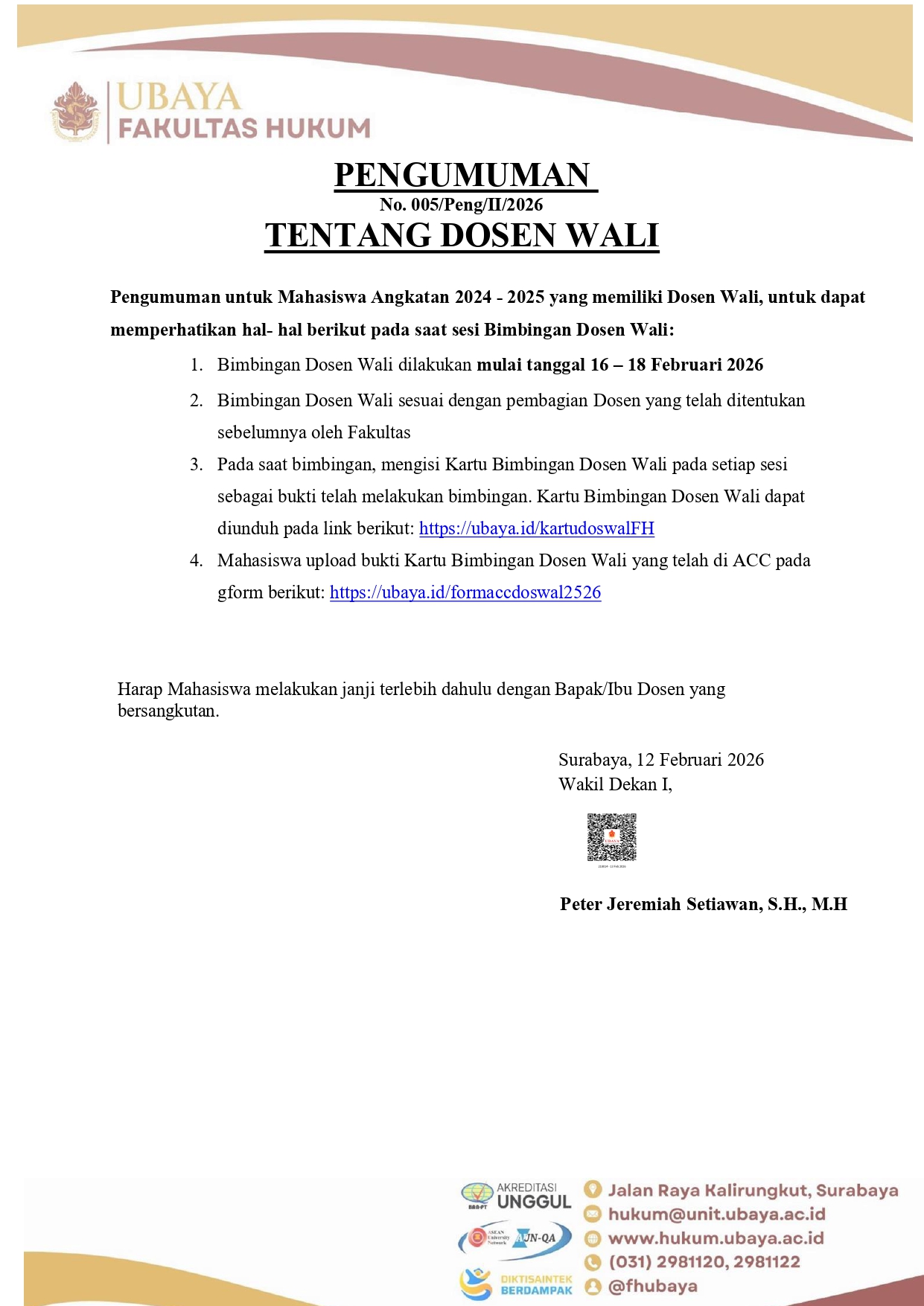 3. Pada saat bimbingan, mengisi Kartu Bimbingan Dosen Wali pada setiap sesi sebagai bukti telah melakukan bimbingan. Kartu Bimbingan Dosen Wali dapat diunduh pada link berikut: https://ubaya.id/kartudoswalFH