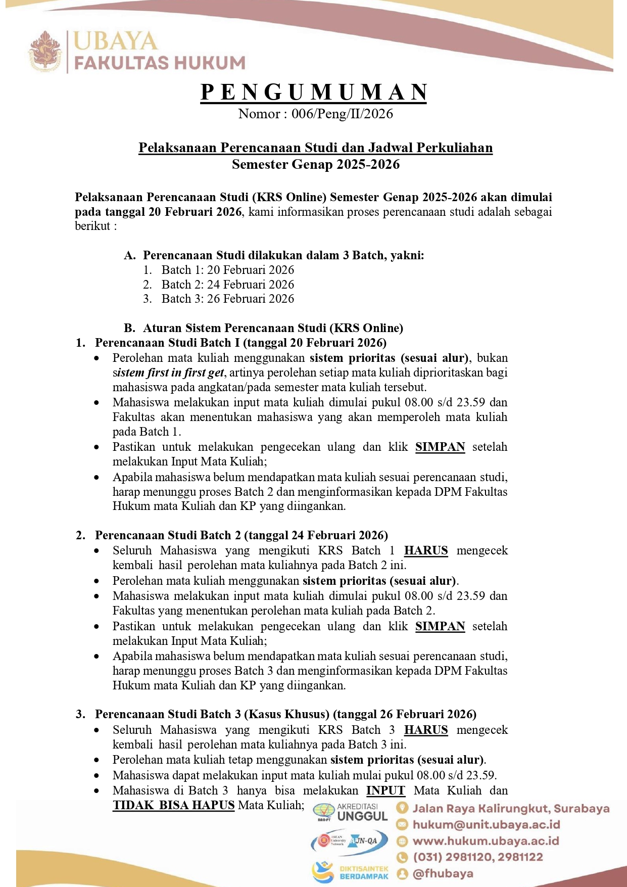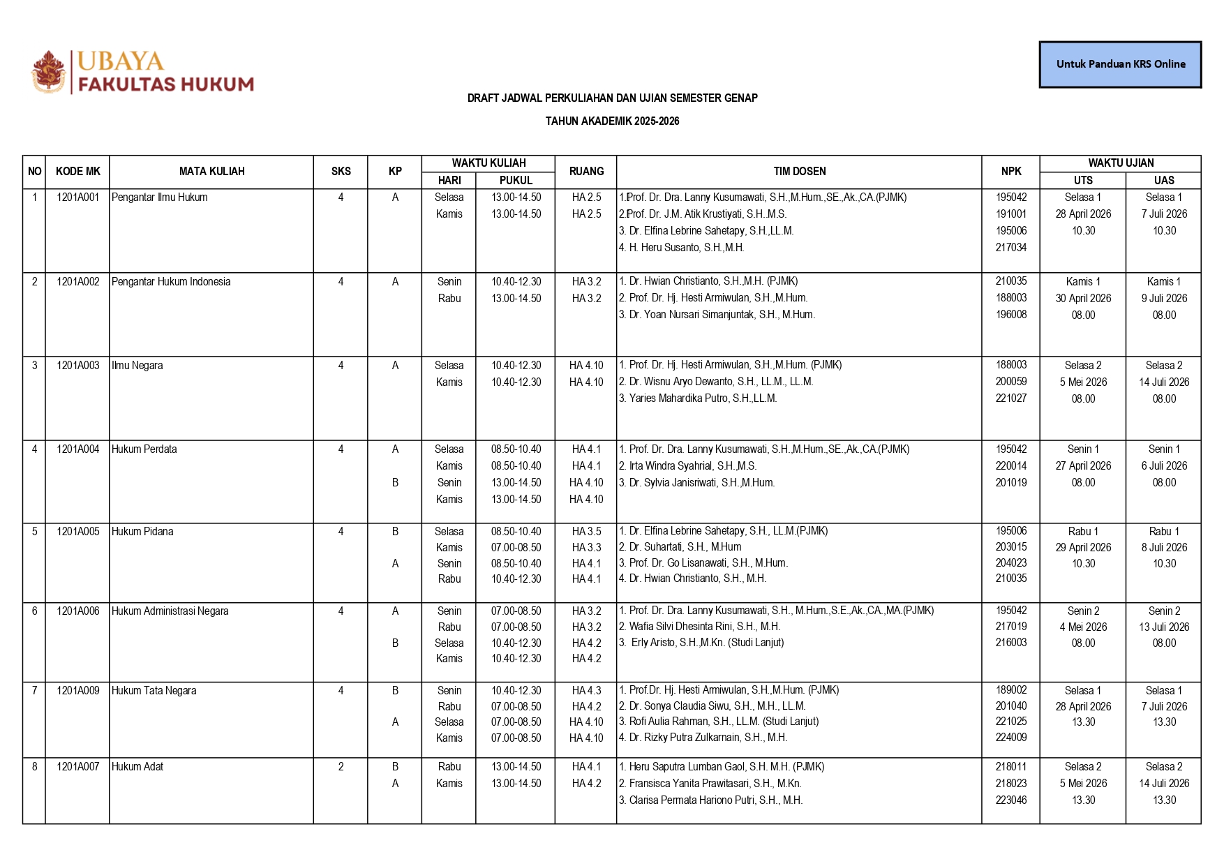Pengumuman KRS dan Draft Jadwal Kuliah Genap 2025 2026