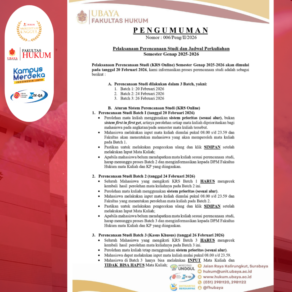 Apabila mahasiswa belum mendapatkan mata kuliah sesuai perencanaan studi, harap menunggu proses Batch 2 dan menginformasikan kepada DPM Fakultas Hukum mata Kuliah dan KP yang diingankan.