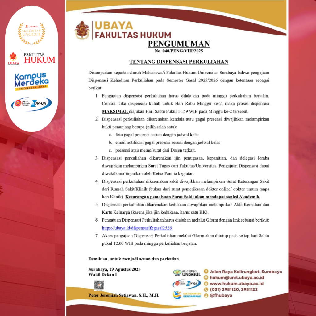 PENGUMUMAN No. 009/Peng/II/2026 TENTANG DISPENSASI PERKULIAHAN Disampaikan kepada seluruh Mahasiswa/i Fakultas Hukum Universitas Surabaya bahwa pengajuan Dispensasi Kehadiran Perkuliahan pada Semester Genap 2025/2026 dengan ketentuan sebagai berikut: Pengajuan dispensasi perkuliahan harus dilakukan pada minggu perkuliahan berjalan. Contoh: Jika dispensasi Read more