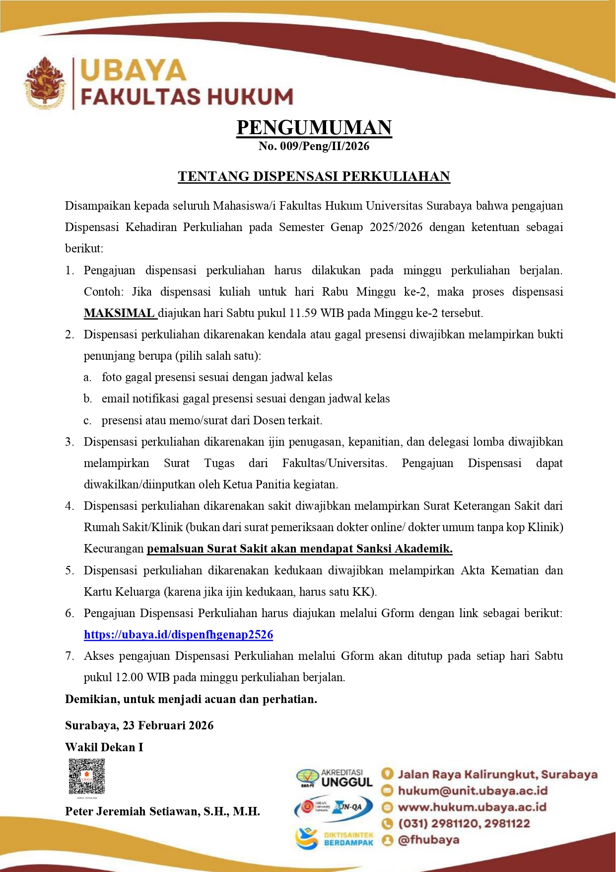 https://hukum.ubaya.ac.id/ Wed, 04 Mar 2026 02:36:55 +0000 en-US hourly 1 https://hukum.ubaya.ac.id/storage/sites/7/2022/10/cropped-ubaya-favicon-300x169-1-32x32.png https://hukum.ubaya.ac.id/ 32 32 Pengumuman Dispensasi Perkuliahan Genap 2025/2026 https://hukum.ubaya.ac.id/2026/03/04/pengumuman-dispensasi-perkuliahan-genap-2025-2026/ https://hukum.ubaya.ac.id/2026/03/04/pengumuman-dispensasi-perkuliahan-genap-2025-2026/#respond Wed, 04 Mar 2026 02:36:14 +0000 https://hukum.ubaya.ac.id/?p=7135 PENGUMUMAN No. 009/Peng/II/2026 TENTANG DISPENSASI PERKULIAHAN   Disampaikan kepada seluruh Mahasiswa/i Fakultas Hukum Universitas Surabaya bahwa pengajuan Dispensasi Kehadiran Perkuliahan pada Semester Genap 2025/2026 dengan ketentuan sebagai berikut: Pengajuan dispensasi perkuliahan harus dilakukan pada minggu perkuliahan berjalan. Contoh: Jika dispensasi kuliah untuk Hari Rabu Minggu ke-2, maka proses dispensasi MAKSIMAL diajukan Hari Sabtu Pukul 11.59 […]