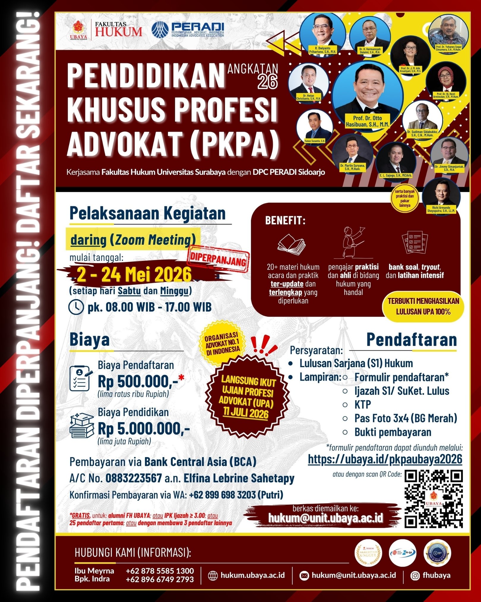 Fakultas Hukum Universitas Surabaya Bekerjasama dengan DPC Peradi Sidoarjo Membuka Pendaftaran Pendidikan Khusus Profesi Advokat Angkatan XXVI